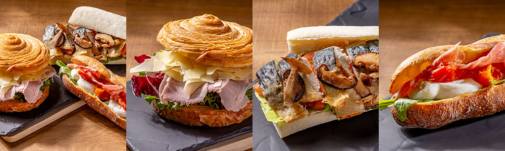 - 生ハム、ブラータチーズ、セミドライトマト、ルッコラ、ジェノベーゼのバゲットサンドウィッチ 1,200円