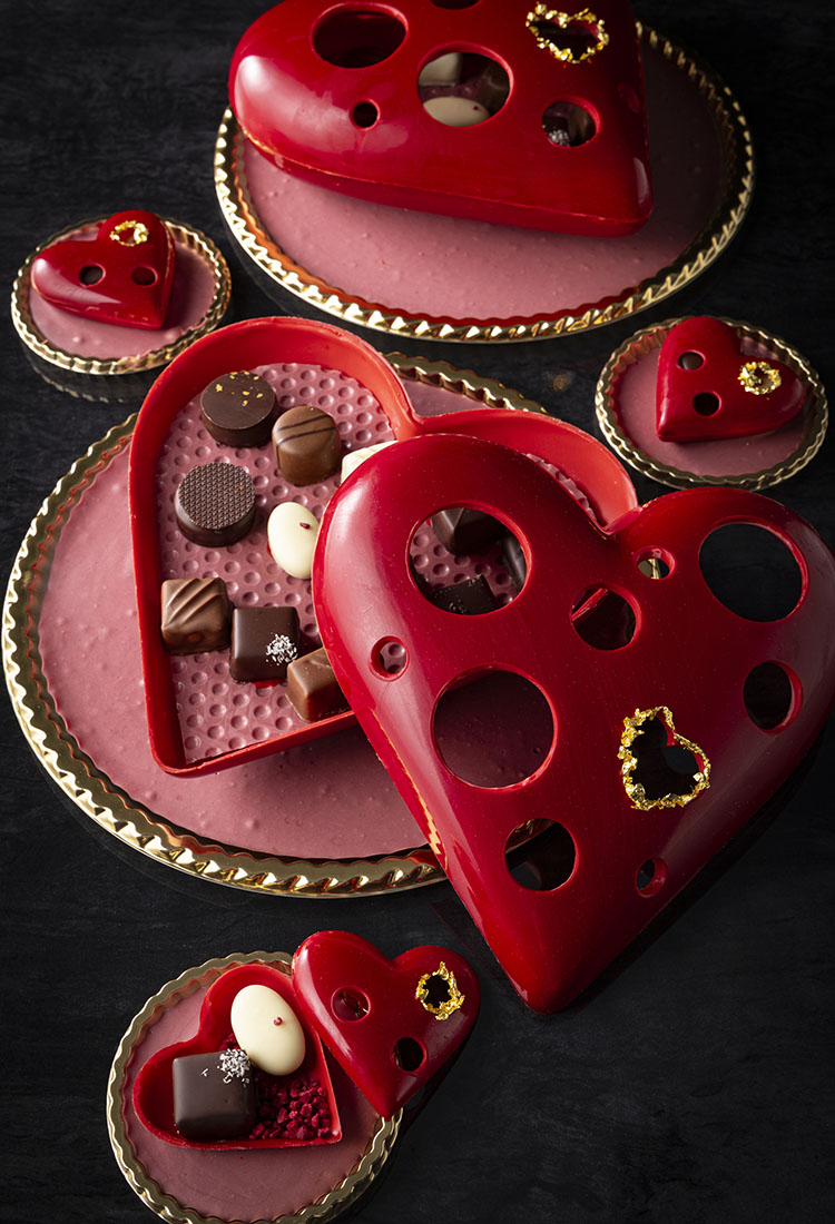 「ビジューハート」は、直径約20cmのLサイズと約6.5cmのSサイズで展開する、艶やかな深紅のハート型ショコラ。