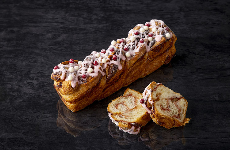東欧発祥のブリオッシュ風発酵菓子パン、バブカをアレンジした「ストロベリーアーモンドバブカ」は、バターと卵をたっぷり使ったデニッシュ生地に、アーモンドクリームとヴァローナ社のインスピレーション・フレーズを合わせたフィリングを巻き込み、ねじりながら焼き上げました。