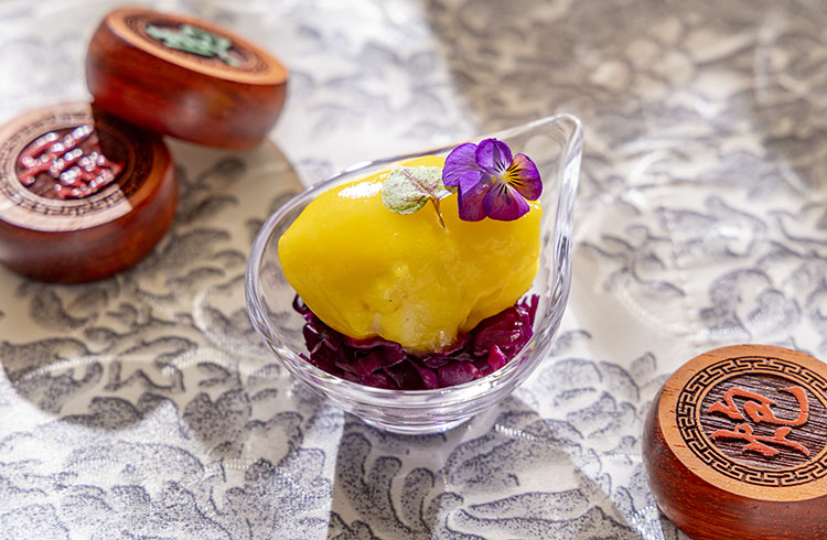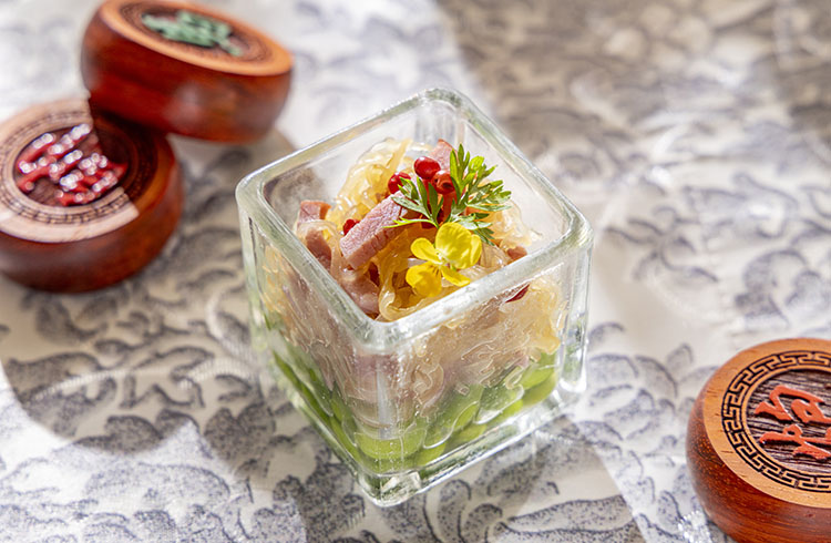 戦乱の三国志の時代、その美貌で戦局をも揺るがしたとされる貂蝉をイメージした一品。枝豆の上にクラゲと細切りにした燻製鴨を配し、バラ香る甘酸っぱいザクロソースを添えました。美を象徴するバラとザクロの余韻がお口いっぱいに広がります。