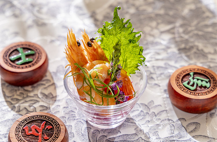 三国志に登場する最大級の実力者の一人であり、魏の礎を築いた曹操。英雄とも冷酷な策士とも語られる二面性が魅力です。白髪ねぎと紅芯大根の上に、葱の香りをうつした塩でマリネした甘エビ。最後に訪れるピリッとした四川青山椒の風味が刺激的です。