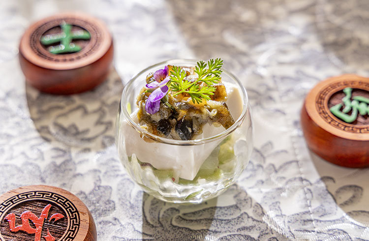 知略で戦局を動かした諸葛亮の一手に着想を得た一皿。葱と生姜の香りをまとわせたピータン豆腐は、静かな奥行きが広がる味わいです。
