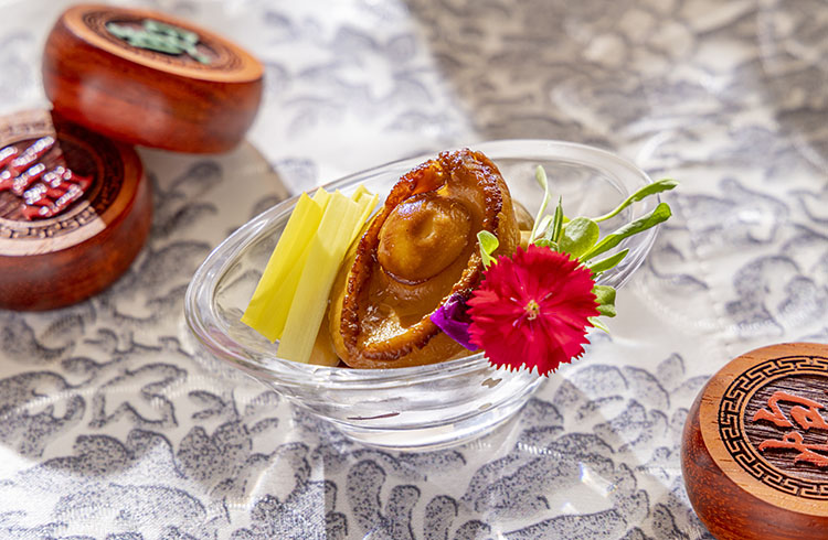 敵陣から十万本の矢を“借りる”という、諸葛孔明の奇策「草船借箭」から着想。鮑を船に見立て、黄ニラともやしで矢を表現しました。オイスターソースと醤油でやわらかく煮上げた鮑は、噛むほどに磯の香りが広がります。