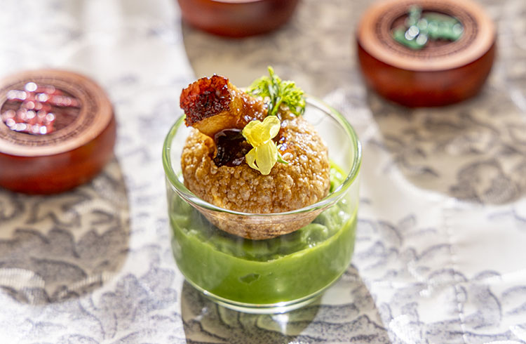 三国志最強の武将と称される呂布は、“一撃で制する”圧倒的な存在感を放ちます。薄く揚げた球状の生地 パニプリの中に、黒酢に蜂蜜を加えて煮詰めたソースで柔らかく仕上げたポークベリーを忍ばせた1品は、呂布の放つ強烈な一撃を彷彿とさせる味わいです。