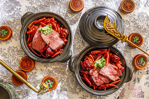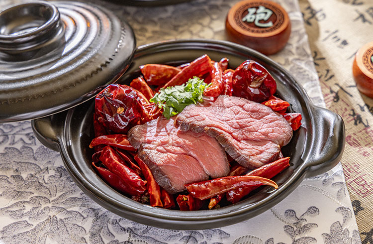 黒毛和牛の低温調理 四川朝天辣椒、唐辛子、山椒のスパイシー香り炒め