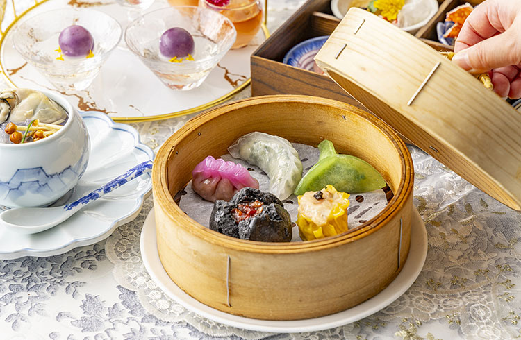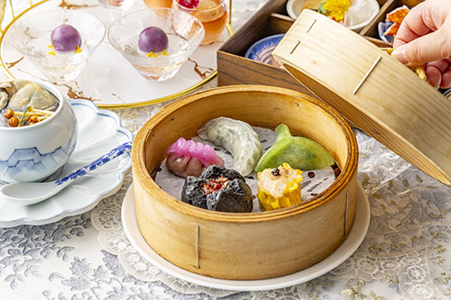 「王朝」料理長 柳谷 雅樹(やなぎや まさき)が苺をアクセントに取り入れてご用意するシェフズスペシャルは、鮑や蟹、黒毛和牛などの高級食材を用い、一品一品丹念に仕上げた9品と、極上コラーゲンスープで構成。熱々の点心食べ放題に加え、優雅なお食事の締めくくりには、鳥籠風アフタヌーンティースタンドでご提供する「金木犀香る黒ゴマ餡の白玉団子」や「ストロベリーエッグタルト」などに加え、素敵なサプライズ演出と共にフレッシュ苺もお楽しみいただけます。