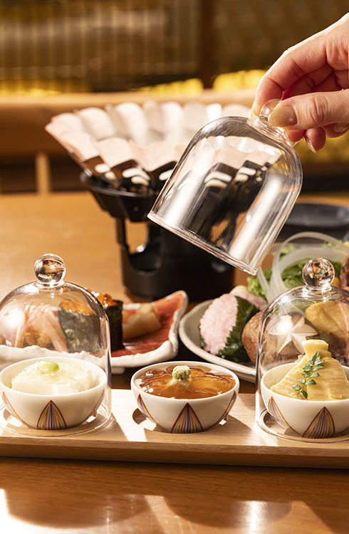 小鉢に入った3種類の前菜は、出汁のジュレを添えた「自家製豆腐」、繊細な甘さの「汲み上げ湯葉」、旬の筍と歯ごたえの良い鳴門若布の「若竹煮」。「2種のお造り」の後はお1人様お1つずつご用意する小鍋が登場します。まだ肌寒さの残る季節に嬉しい、鰹節と昆布の出汁を上品にきかせた豆乳鍋のまろやかな香りに包まれながら蟹や合鴨、蛍烏賊に加え、桜葉の香りがふわりと広がる桜道明寺や生桜麩、季節野菜などを胡麻だれやポン酢と共にお楽しみいただけます。