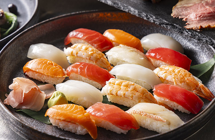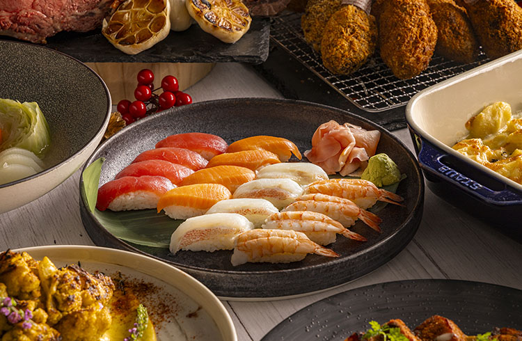 マーブルラウンジ冬のディナービュッフェは、日替わり三種の新鮮なネタを使用した握り寿司、3種のお味でご賞味いただける生牡蠣、お肉の旨みを存分に楽しめるマーブルラウンジ名物のローストビーフの他、「味噌風味のメープルシロップでマリネしたローストダック」、「ブルゴーニュ風牛肉の煮込み」など大満足なお肉料理が’揃います。