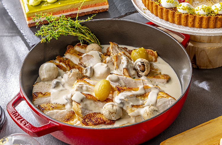 秋の味覚をふんだんに取り入れた、多彩なメニューが揃う「マーブルラウンジ」のランチビュッフェ。フレッシュな野菜とヘルシーなコンディメントで仕立てるカスタムサラダから始まり、サフラン香るパンプキンスープや、きのことトリュフの芳醇なスープは、ホテルメイドのブレッドとともにお楽しみいただけます。ライブカービングでは、香ばしいバターの風味が広がるパイで包んだサーモンをご用意。そのほか、「レモングラスとベトナムコーヒーでマリネしたBBQポークベリー」や「ジャマイカンスパイス香るカレー」、「クリーミーなジェノベーゼ風ポテトニョッキ」など、世界のエッセンスを取り入れたメインディッシュも取り揃えています。お食事の最後には「無花果とライチクリームのガトーショコラ」や「りんごのシュトゥルーデル チャイクリーム添え」など、10種類以上のスイーツをラインアップ。コーヒーや紅茶とともに、優雅な秋のひとときをごゆっくりお過ごしください。