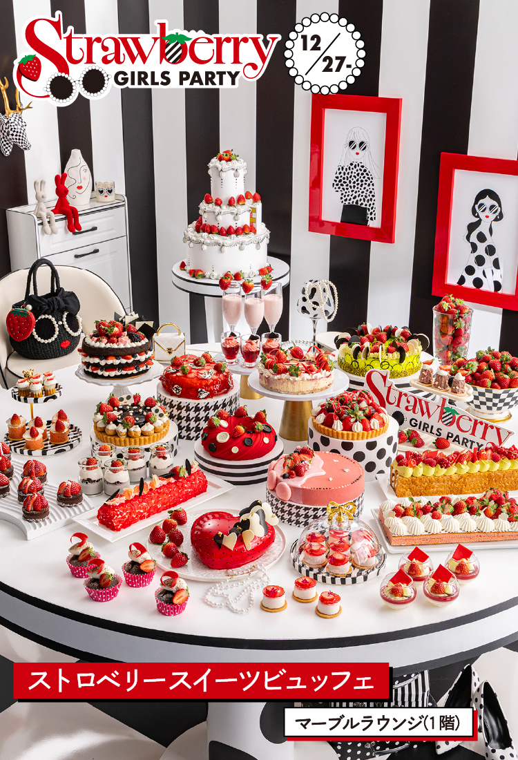 毎年恒例のいちご尽くしのスイーツビュッフェ。今年は“モノクロ・ガールズパーティー”をテーマに、女の子のお部屋をイメージした2Dとリアルが交差するデコレーションの中、たっぷりの苺を用いた20種類以上のストロベリースイーツが、まるでドレスやアクセサリーのように華やかに並び、空間を甘く彩ります。