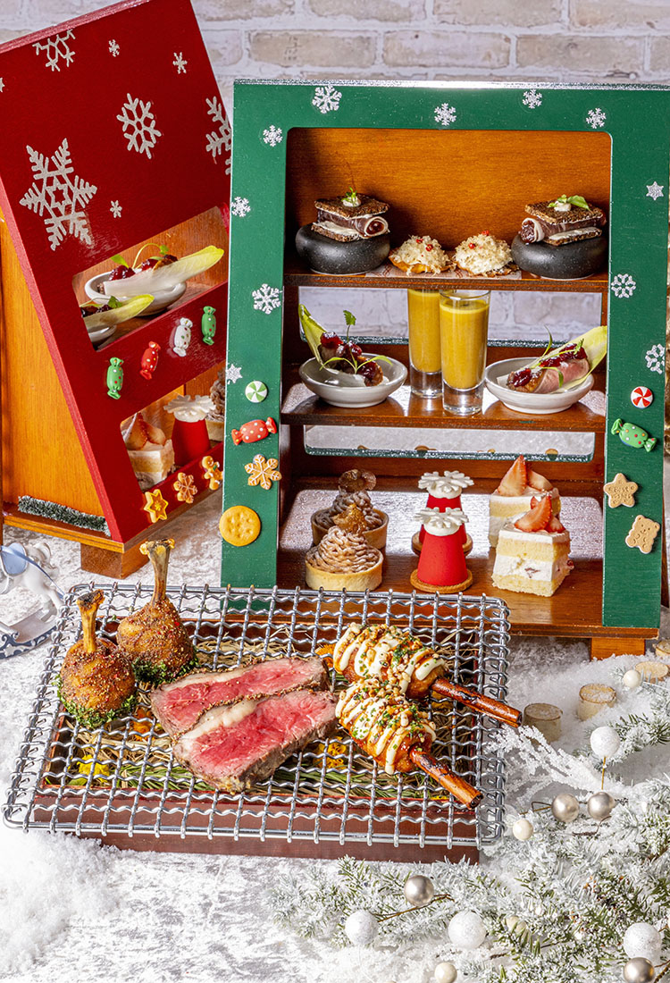 3種類の焼き立て肉料理に加え、特製スタンドには4種類の前菜とクリスマススイーツが彩りよく配され、まるでクリスマスプレゼントを1つずつ開けているようなワクワク感をお届けします。甘いものはあまり得意ではないけれど、フォトジェニックなアフタヌーンティー気分を楽しみたい方はもちろん、おしゃれな午後のひと時や、遅めのランチにもおすすめです。