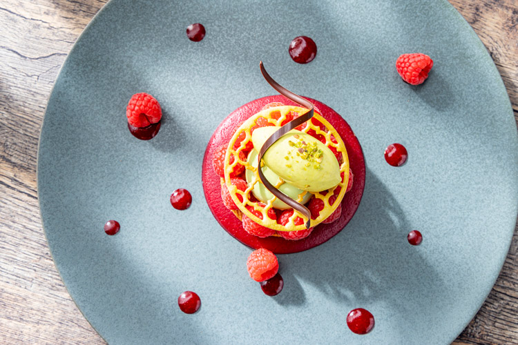 - ピスタチオムース、シチリアピスタチオクリーム、レッドベリーコンポートゼリー、ピスタチオビスケット