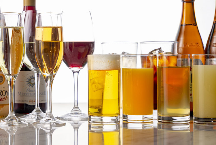 ビール、赤ワイン、白ワイン、コカ・コーラ、オレンジジュース、グレープフルーツジュース、アイスウーロン茶