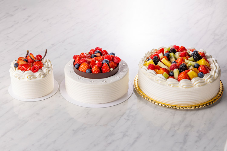 フルーツが飾られたホールケーキを3種類ご用意しております。それぞれご希望のメッセージを添えてご提供します。