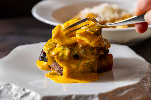 - フリーレンジポーチドエッグ、ベアルネーズ、赤玉ねぎのピクルス、スパイシーBBQソース