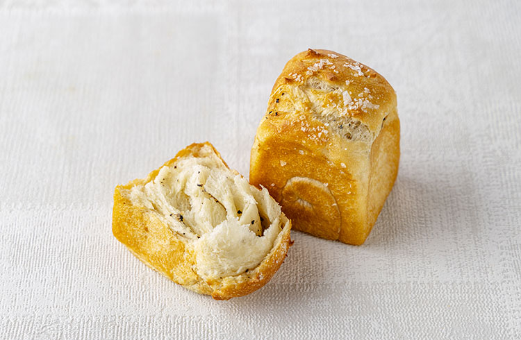 香り高くモチモチ食感の「塩トリュフバター」は北海道産小麦を使用し、3日間かけてじっくり仕込むこだわりの製法。湯種製法で小麦の一部を熱湯処理し、お餅のようになめらかな食感を引き出します。さらに低温でじっくり熟成させた生地には刻んだトリュフと白トリュフオイル、無塩バター、フランス産フルール・ド・セルを贅沢に練り込み、スチームを加えながらふんわりと焼き上げていきます。口に含むと芳醇なバターとトリュフの香りがじわっと広がりそのままでも軽くトーストしても美味しく味わっていただけます。